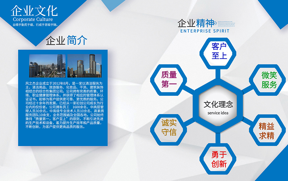 公司是一家以清潔服務為主,旅游,干洗、化妝品、裝修和餐飲相結(jié)合的多元化發(fā)展運營的服務性企業(yè)。企業(yè)本著誠信第一、服務至上的原則,依靠公司盡我所能、力我所及的信條從2012年到現(xiàn)在服務了多家企業(yè),現(xiàn)在我們已經(jīng)擁有了400家左右的清潔服務項目和多家洗衣店。我們會一直牢記服務,創(chuàng)新才是我們企業(yè)發(fā)展的服務宗旨。